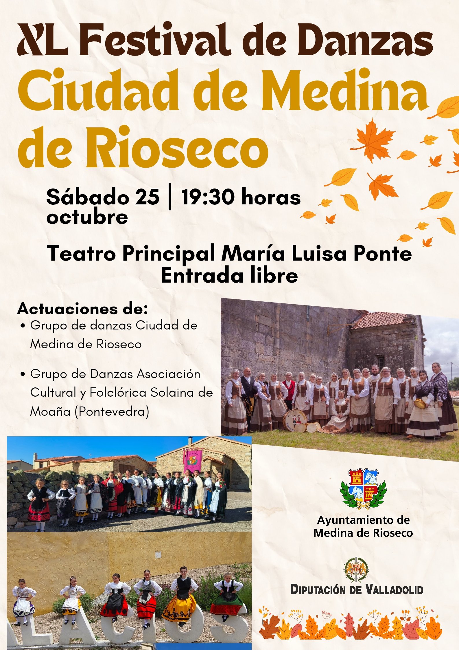 El Teatro Principal «María Luísa Ponte» acoge el XL Festival de Danzas Ciudad de Medina de Rioseco, con la participación de Grupo de Danzas Medina de Rioseco y Grupo de Danzas de la Asociación Folclórica Solaina de Moaña (Pontevedra).